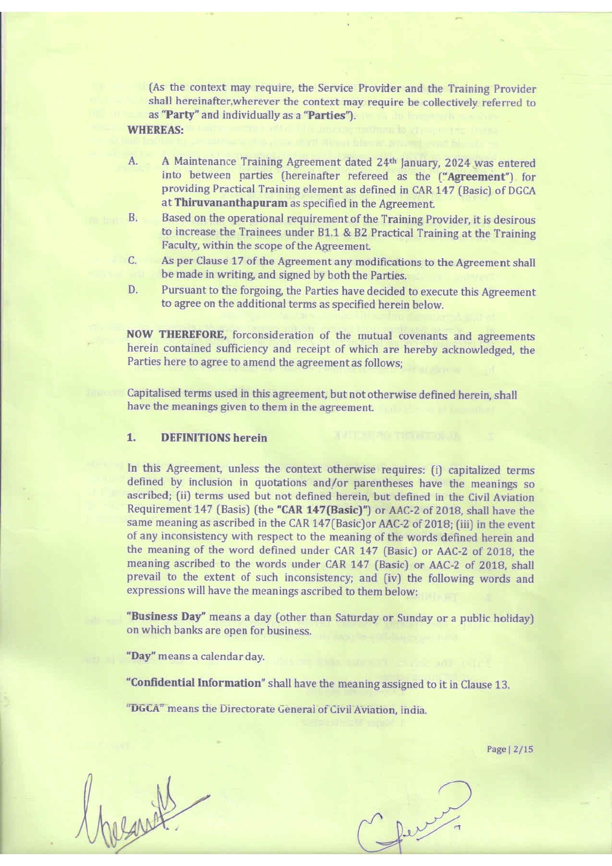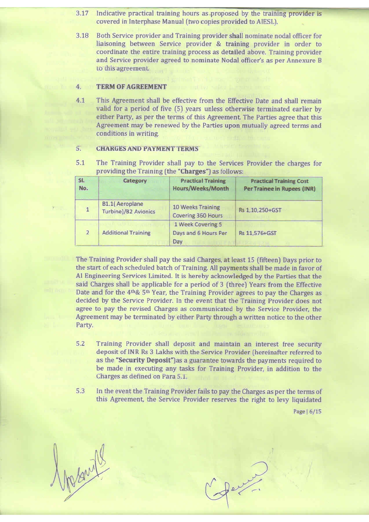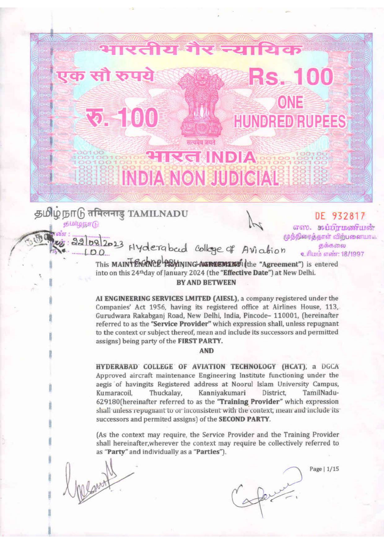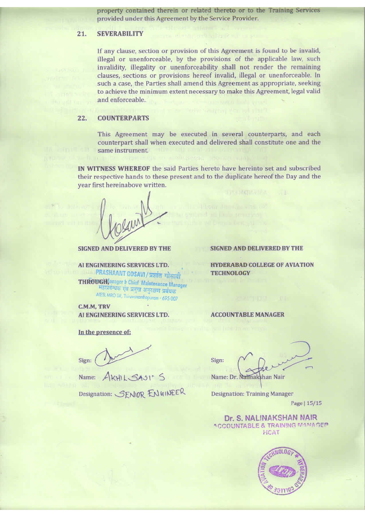 For providing 360 hours training for AME students, HCAT has entered into an agreement with Air India Engineering Services Limited(AIESL), Thiruvananthapuram.